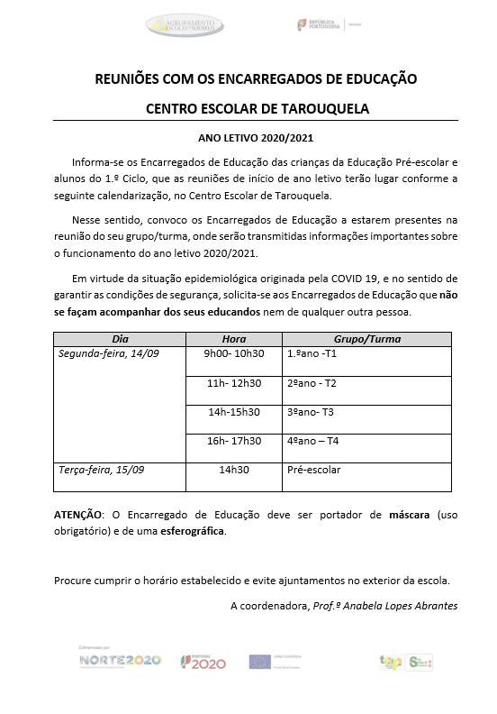 REUNIÕES COM OS ENCARREGADOS DE EDUCAÇÃO CENTRO ESCOLAR DE TAROUQUELA ANO LETIVO 2020/2021
